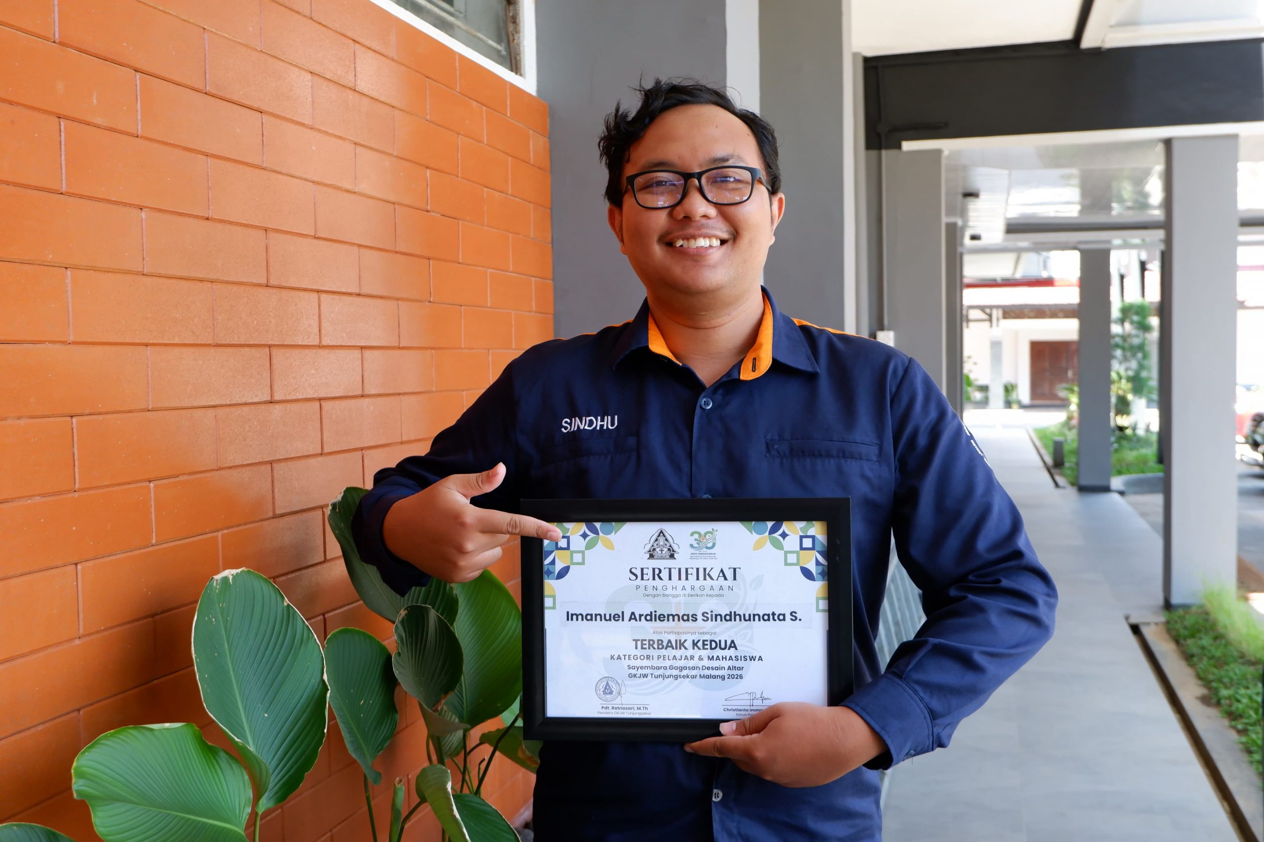 Jurnalismalang – Membawa nafas budaya Jawa Timur ke dalam ruang suci, Imanuel Ardiemas Sindhunata S., mahasiswa Arsitektur S-1, Institut Teknologi Nasional Malang (ITN Malang), sukses meraih posisi Juara 2 dalam Sayembara Gagasan Desain Altar GKJW Tunjungsekar Malang 2026. Kompetisi tingkat Jawa Timur ini mencapai puncaknya pada sesi awarding yang digelar untuk merayakan perayaan ulang tahun ke-30 gereja tersebut, Minggu (12/04/2026).