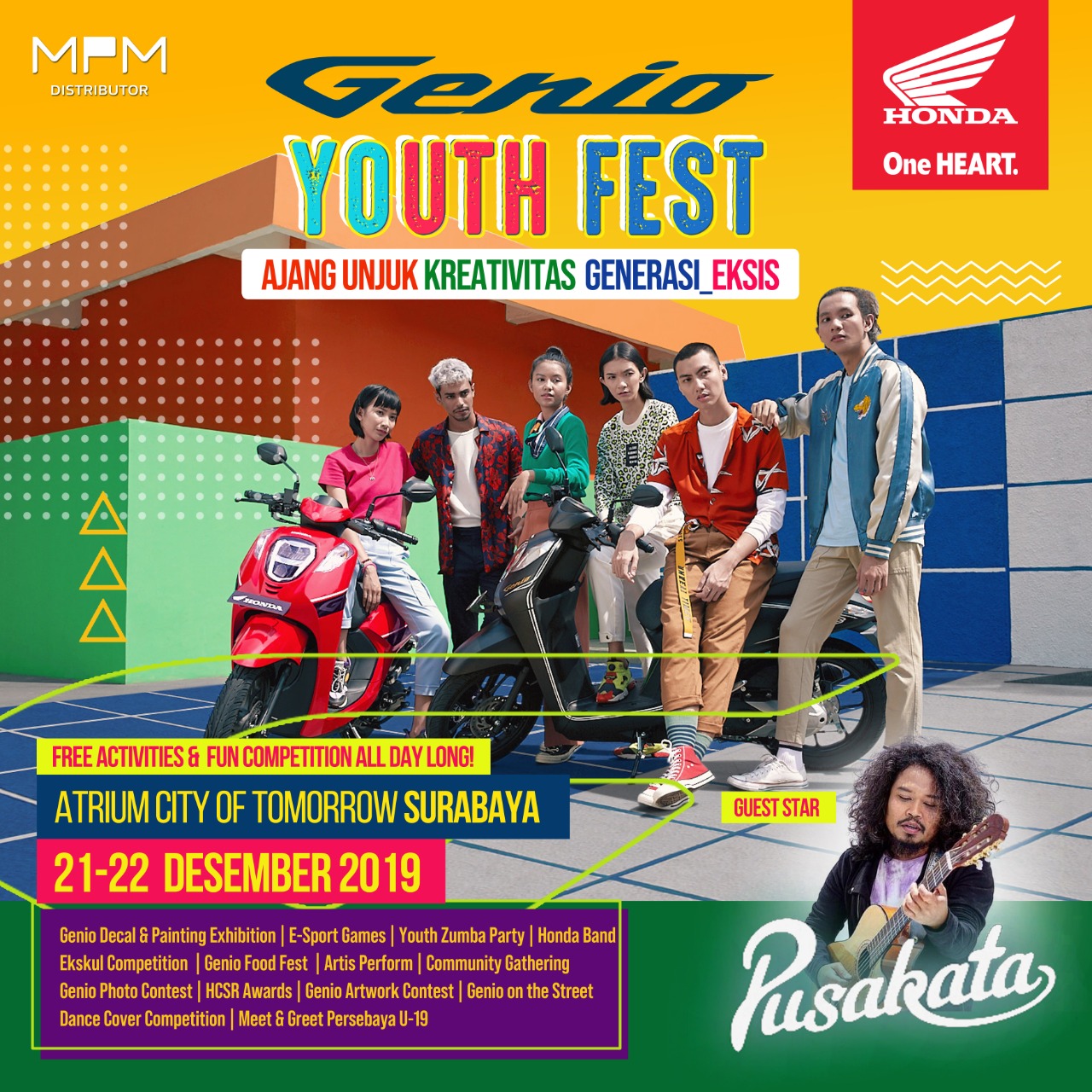 Jurnalismalang – Sebagai bentuk apresiasi terhadap gerakan milenial yang memiliki passion PT. Mitra Pinasthika Mulia (MPM) distributor sepeda motor dan suku cadang Honda wilayah Jawa Timur (Jatim) dan Nusa Tenggara Timur (NTT), menggelar Genio Youth Fest sebagai wadah kreativitas generasi Eksis. Kegiatan tersebut akan diselenggarakan pada tanggal 21-22 Desember 2019 di Atrium City Of Tomorrow, Surabaya.